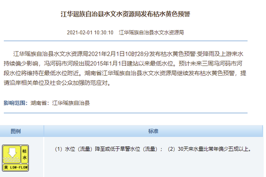 2月1日,水利部水文情报预报中心消息,江华瑶族自治县水文水资源局2021年2月1日10时28分发布枯水黄色预警:受降雨及上游来水持续偏少影响,冯河码市河段出现2015年1月1日建站以来最低水位。预计未来三周冯河码市河段水位将维持在最低水位附近。湖南省江华瑶族自治县水文水资源局继续发布枯水黄色预警,提请沿岸相关单位及社会公众加强防范应对。